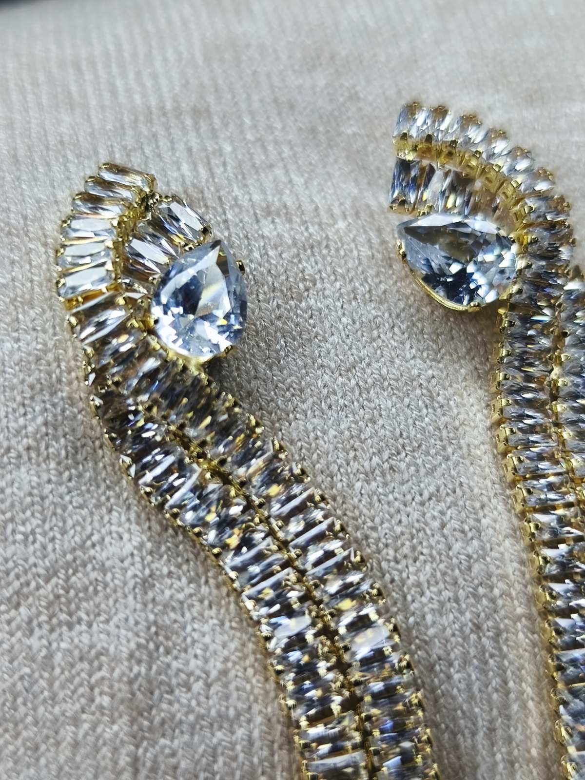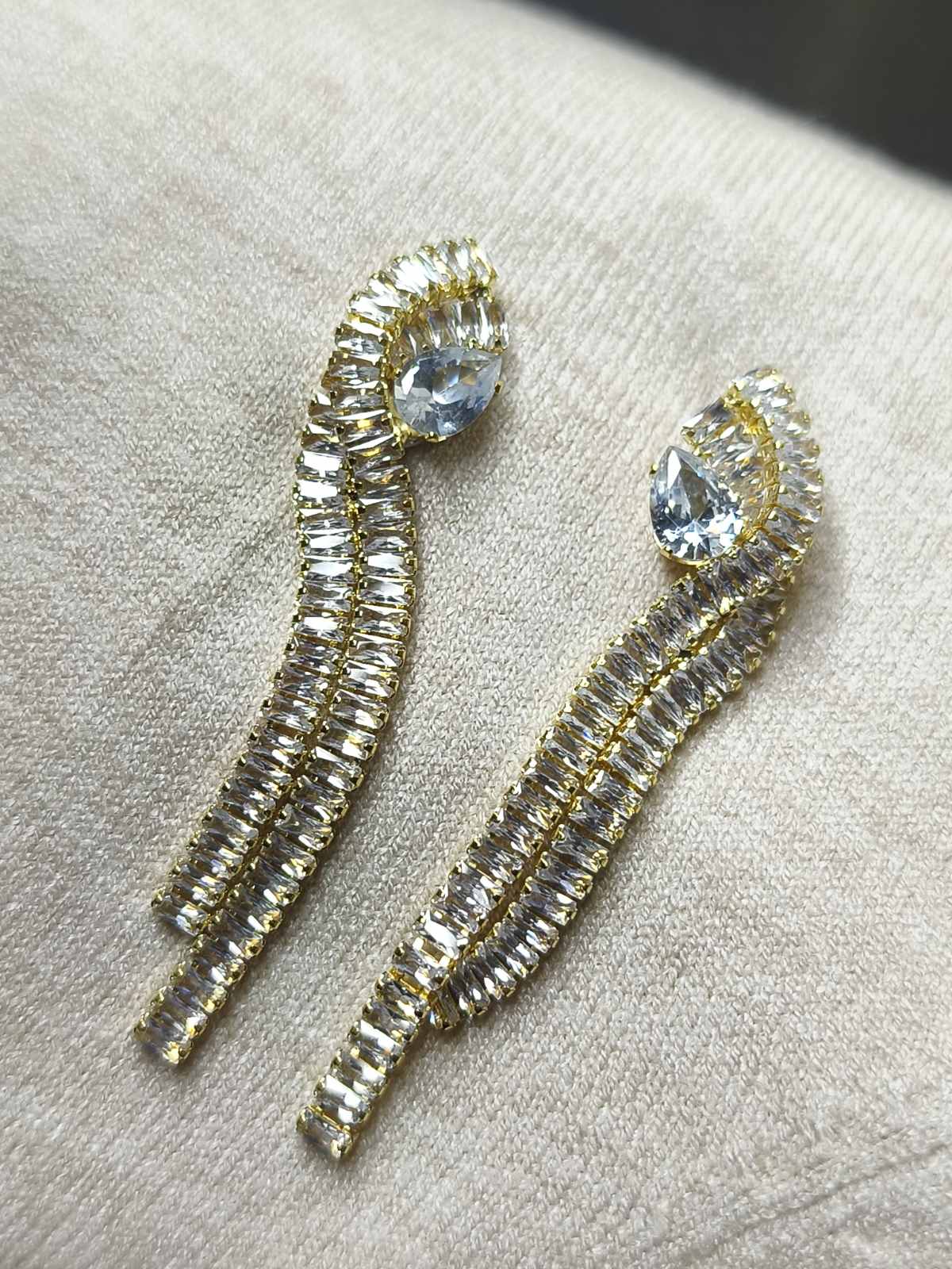 Εντυπωσιακά μακριά σκουλαρίκια σε χρυσό τόνο, διακοσμημένα με λαμπερά διάφανα κρύσταλλα κοπής baguette που δημιουργούν μια κομψή, ρευστή κίνηση. Η σταγόνα στο επάνω μέρος προσθέτει φινέτσα και πολυτέλεια, χαρίζοντας έντονη λάμψη σε κάθε εμφάνιση.