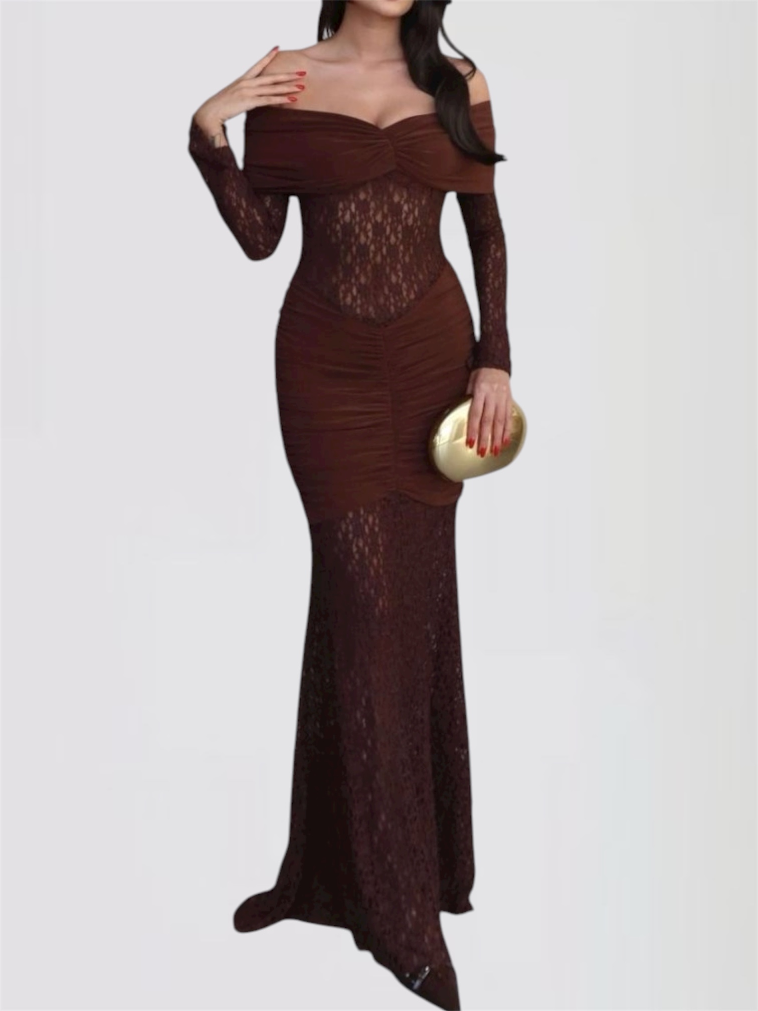 Εντυπωσιάστε με αυτό το κομψό και αισθησιακό μακρύ φόρεμα σε βαθύ καφέ χρώμα. Ο κορσές με ντραπέ σχέδιο και οι ώμοι εκτός αναδεικνύουν τη θηλυκότητα, ενώ η δαντέλα με διακριτική διαφάνεια προσφέρει ένα εκλεπτυσμένο και ταυτόχρονα σαγηνευτικό αποτέλεσμα. Η εφαρμοστή γραμμή αγκαλιάζει το σώμα, δημιουργώντας μια κομψή και αρμονική σιλουέτα. Ιδανικό για βραδινές εμφανίσεις, κοκτέιλ πάρτι ή ιδιαίτερες περιστάσεις.