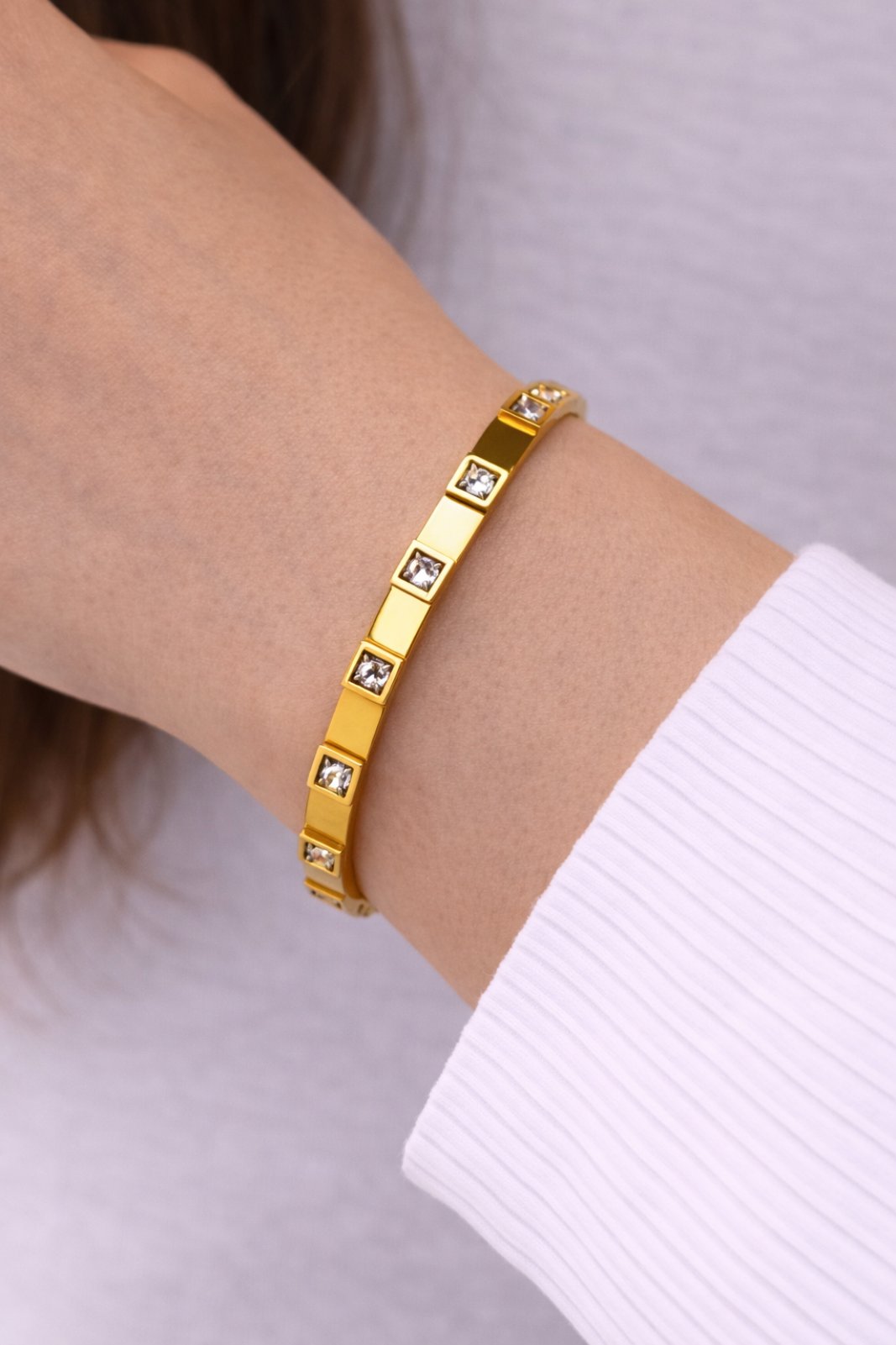 Minimal και κομψό βραχιόλι με γεωμετρικό σχεδιασμό από τετραγωνισμένα links, διακοσμημένα με λαμπερά ζιργκόν. Ο συνδυασμός της καθαρής γραμμής με τις διακριτικές πέτρες δημιουργεί ένα σύγχρονο και ταυτόχρονα διαχρονικό κόσμημα.