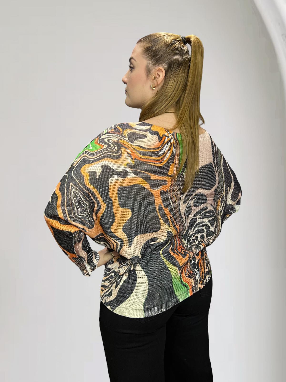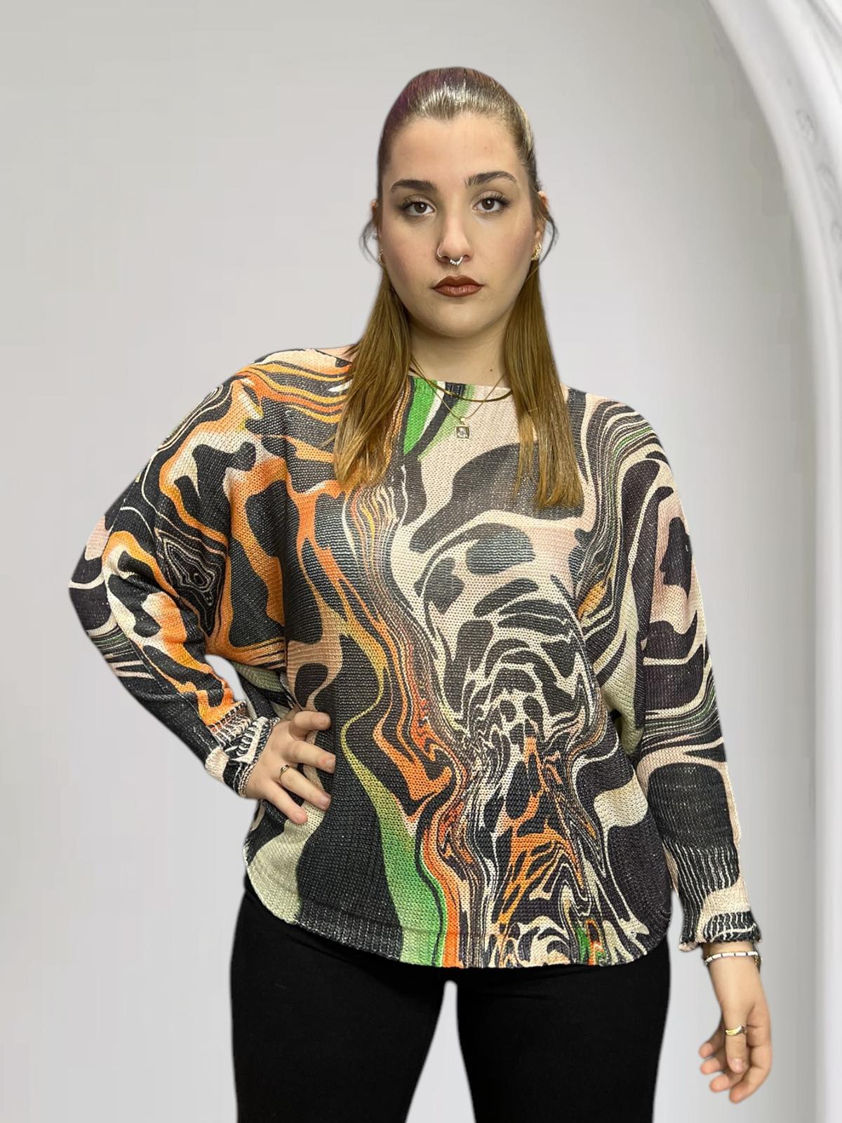 Πλεκτή μπλούζα με χρυσή κλωστή one size.Εμπριμέ που μπορεί να φορεθεί από το πρωί έως το βράδυ.
