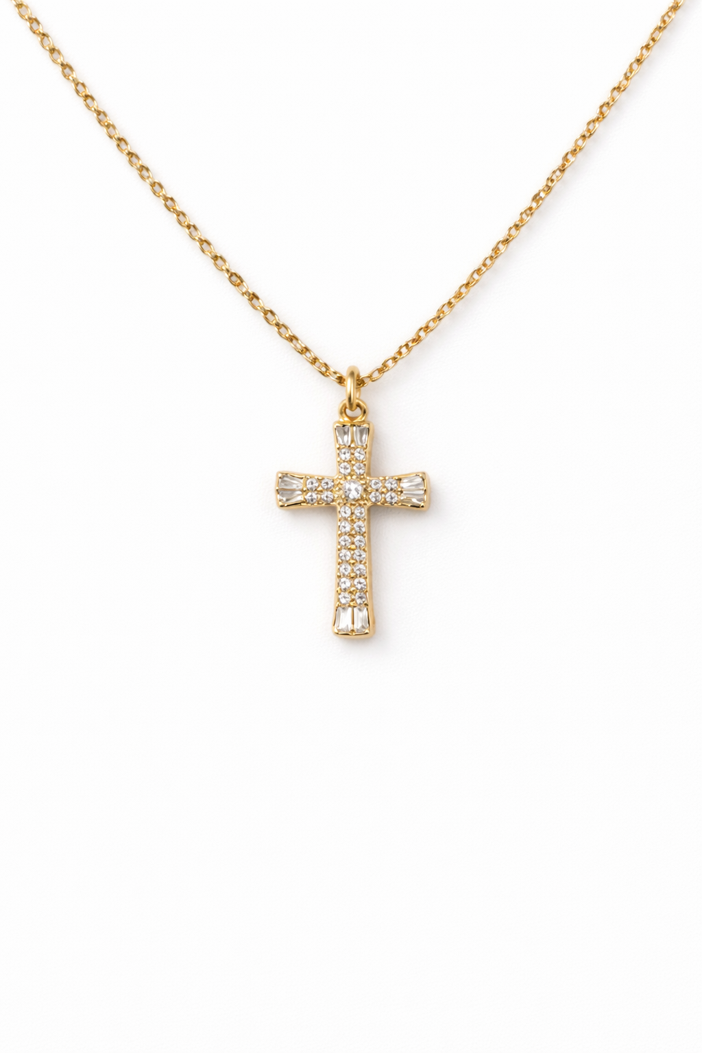 Κομψό κολιέ με σταυρό διακοσμημένο με λαμπερά ζιργκόν σε συνδυασμό στρογγυλών και baguette κοπών, που δημιουργούν ένα εντυπωσιακό αλλά ταυτόχρονα διακριτικό αποτέλεσμα. Ο σχεδιασμός του χαρίζει extra λάμψη και αναδεικνύει μοναδικά το κόσμημα.