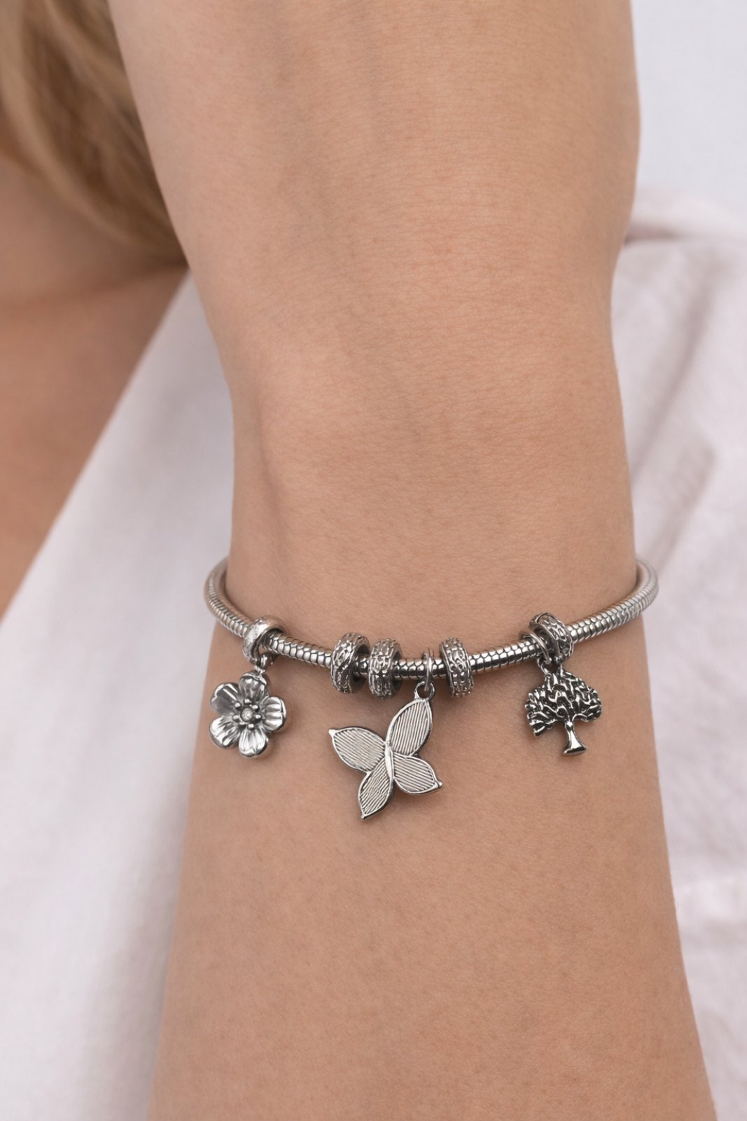 Ένα κομψό ασημί βραχιόλι εμπνευσμένο από τη φύση. Διακοσμημένο με charms λουλουδιού, πεταλούδας και δέντρου, συμβολίζει την ομορφιά, την ελευθερία και τη δύναμη της ζωής. Ο διαχρονικός σχεδιασμός του το κάνει ιδανικό για καθημερινές εμφανίσεις αλλά και για πιο ιδιαίτερες στιγμές.